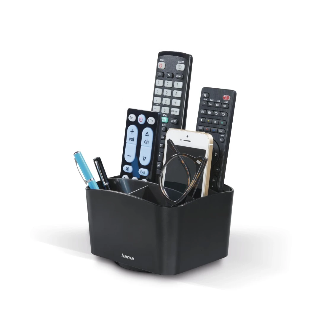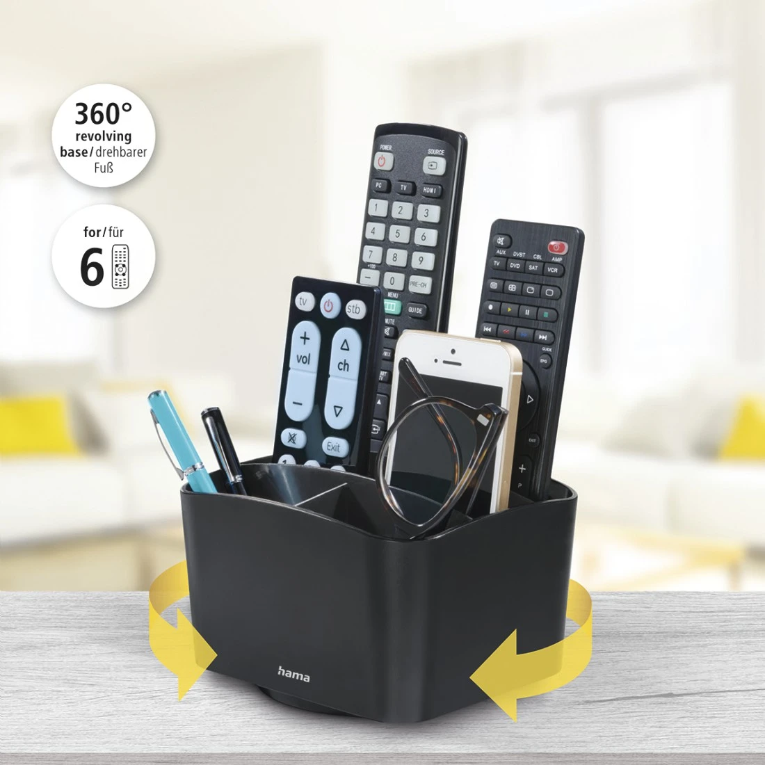 Universal remote control holder for the clear and tidy storage of remote controls, mobile phones, controllers, pens, glasses, etc.